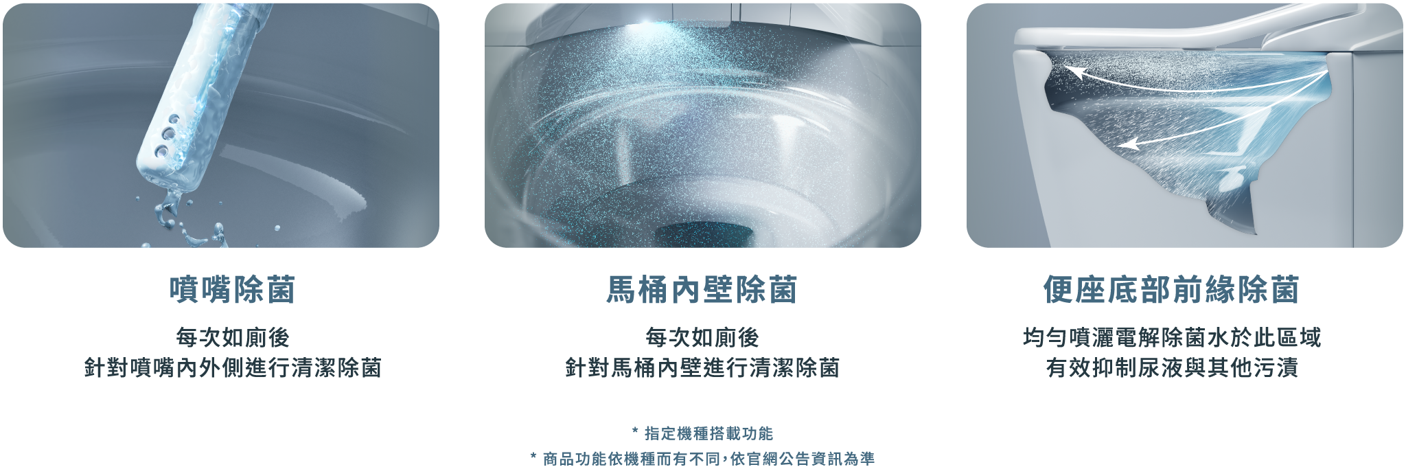 深入清潔噴嘴、馬桶內壁、便座底部前緣
